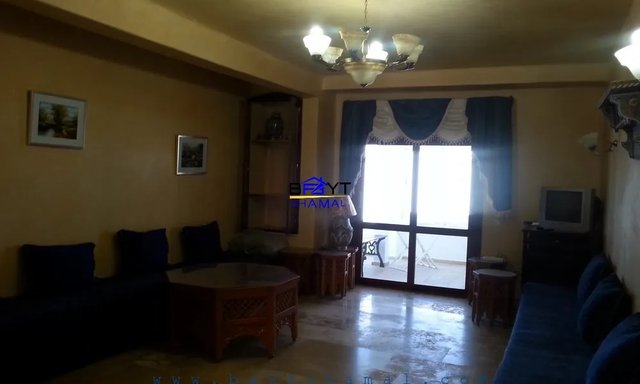 Bel appartement RDC, meuble, a louer au complexe AL AMINE. Une superficie de 110 m2 qui se compose de 3 ch, une avec salle de bain, grand salon qui donne sur l’exterieur et ayant un acces a la plage, cuisine equipee, WC ’appartement dispose d’un bon voisinage et un acces direct au parking, qui est surveille 24/24.